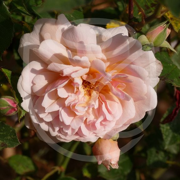 Fleurs très pleines, en quartiers, d'un beau rose nacré sur un feuillage bleuté.