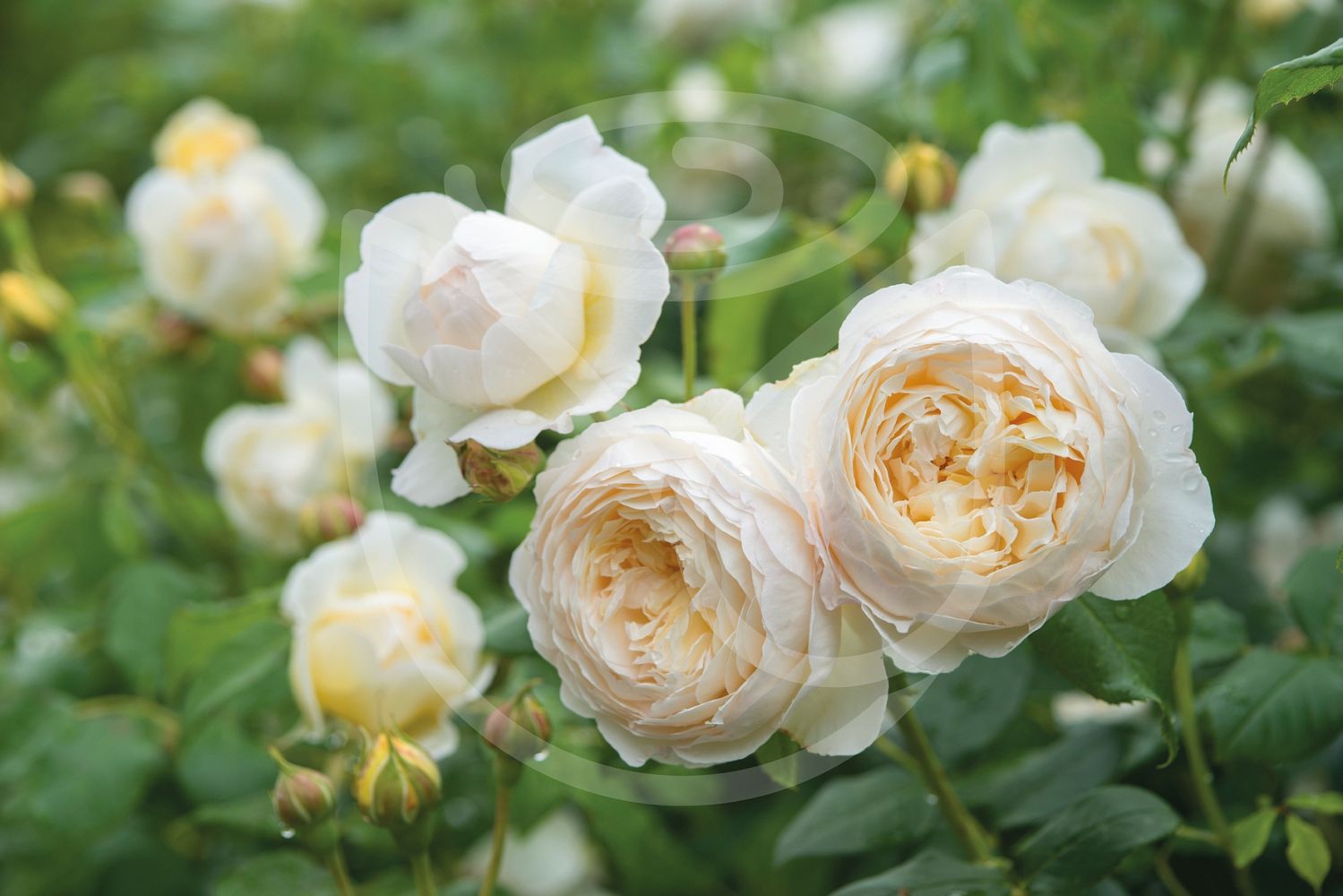 Le feuillage vert mat, dense et très sain, souligne la couleur blanc crème de sa floraison. Les boutons jaune citron clair s’ouvrent progressivement en grandes fleurs en coupes profondes, d’un blanc crème lumineux. Les pétales extérieurs, disposés avec précision en cercles concentriques, confèrent aux roses une architecture parfaite et un charme intemporel.