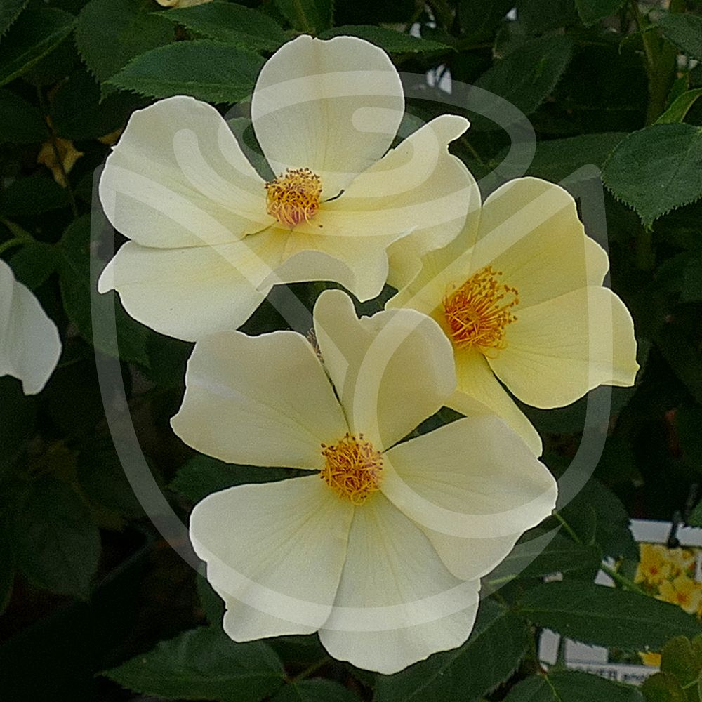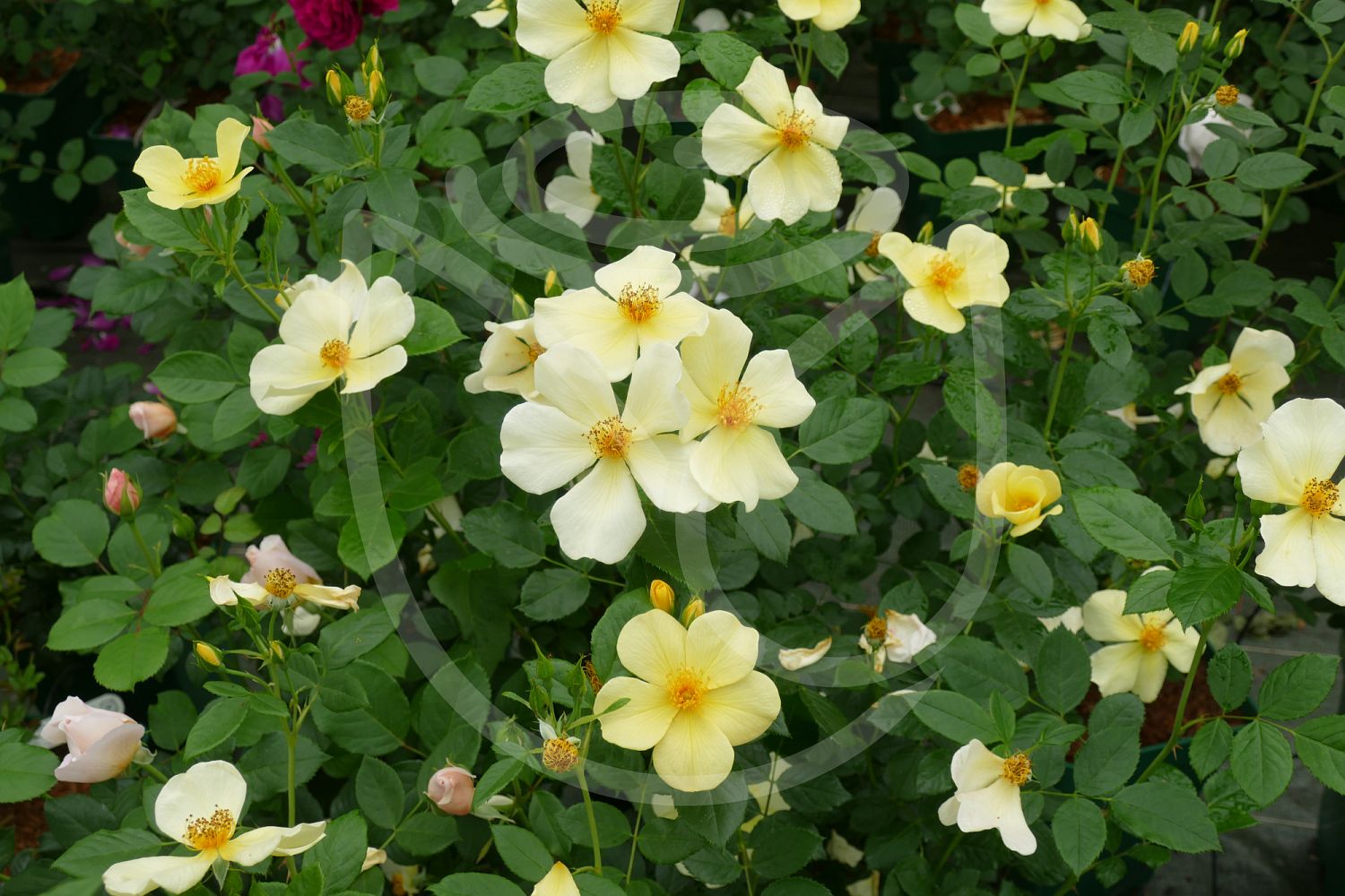 Des fleurs simples jaunes regroupées en grands bouquets est le secret de la splendeur du rosier Tottering by Gently®.