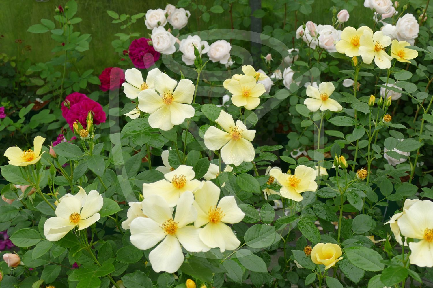 La même variété derosier ou groupe de rosiers peut être planté plusieurs fois de façon dispersée afin de créer une touche de rappel au travers les différentes variétés et catégories de végétaux. On peut réaliser des contrastes ou des harmonies en colorimétrique en ciblant d’autres végétaux en fleurs aux mêmes périodes ou avec un feuillage insolite.