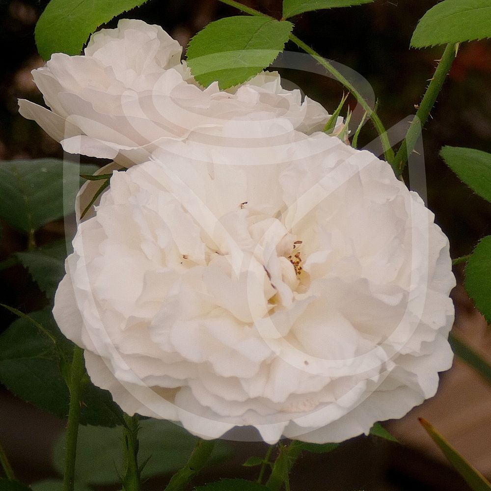 Les boutons légèrement rosés au départ s’ouvrent en rosettes blanches avec un parfum délicieux de roses anciennes.