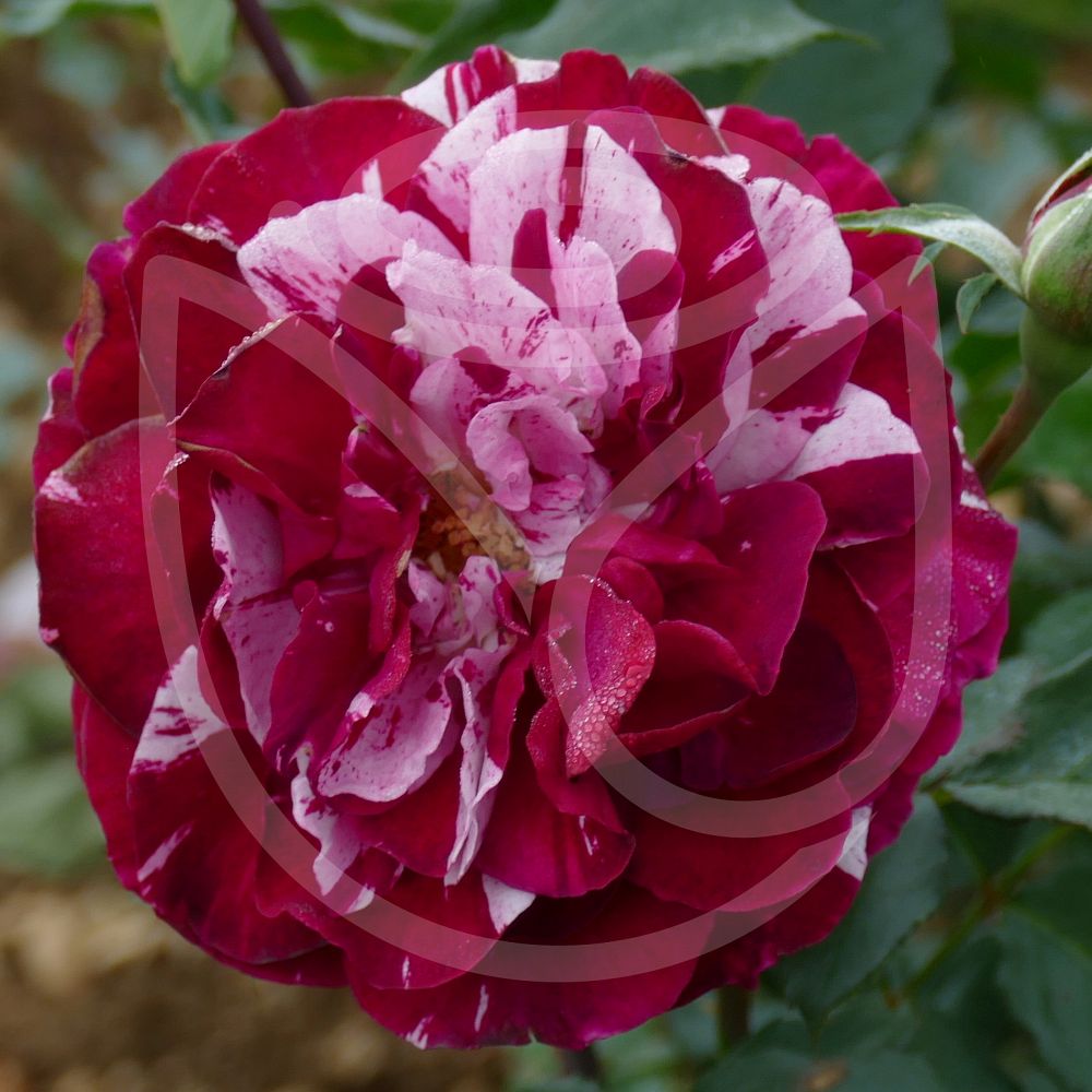 Le rosier buisson New Imagine® se distingue par ses couleurs rouge pourpre et blanche disposées aléatoirement en strie.