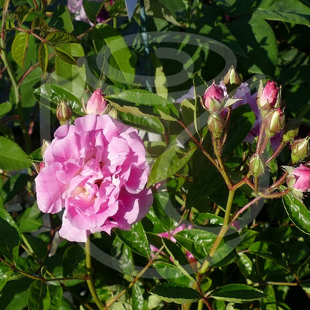 Totalement sans épine, caractéristique intéressante pour couvrir les lieux de passage. Grands bouquets de fleurs doubles moyennes de couleur rose frais aux étamines jaune paille.